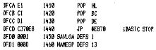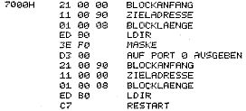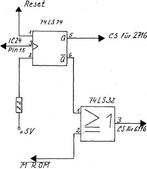 Nach anfaenglichen Schwierigkeiten laufen nun 2 BASF 6106 Laufwerke an meinem Nascom 2 zur vollsten Zufriedenheit. Zunaechst hatte ich Aerger mit meinem Speicher (64kb statisch) der sich dann aber recht einfach loesen lies.Dann kam das Problem mit der Monitorumschaltung. Das Betriebssystem steht bei mir in einem EPROM vom Typ 2716 und wird jetzt in einem ebenfalls statischen Speicher vom Typ 6116 copiert. Der 6116 steckt in einem freien ROM/EPROM-Sockel des Nascom 2,die eigentlich nur fuer 1kb Speichertypen vorgesehen sind. Durch das dazulegen von Adresse 10 lassen sich aber auch 2kb Typen verwenden. Die Umschaltung von EPROM auf RAM erfolgt durch einen 74LS74 der von Port 0 angesprochen wird. Das Signal von Pin 6 des 74LS74 wird mit dem „MROM“-Signal verknotet und ergibt so „CS“ fuer den 6116. Pin 5 des 74LS74 wird mit dem herausgebogenem Pin 18 (CS) des 2716 verbunden. Nachfolgend die kurze copier-routine, die bei mir auf Adresse 7000h steht.