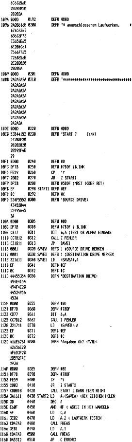 Das naechste Programm ist Backup. Ich habe es so geaendert, daß jetzt von jedem Laufwerk zu jedem Laufwerk kopiert werden kann. Es kann auch mit einer Gemischtkonfiguration ( 5″+8″) gearbeitet werden. Ich finde, daß es besser ist, wenn man Quelle und Ziel selbst bestimmen kann.