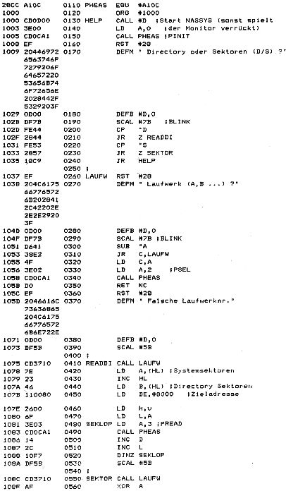 ZEAP Z80 Assembler – Source Listing 0010 ;HELP FÜR EMDOS 10.12.84 G.B. Köln 0020 ;---------------------------------------- 0030 ;kann DIRECTORY nach #8000 laden oder 0040 ;einzelne Sektoren in einen anzugebenden 0050 ;Speicherbereich laden oder nur ein 0060 ;Verify (jeden Sektor in die selben 0070 ;1/4K RAM laden) durchführen. 0080 ;Sektoren sind jeweils relativ zu den 0090 ;Systemspuren zu verstehen. 0100 ;----------------------------------------