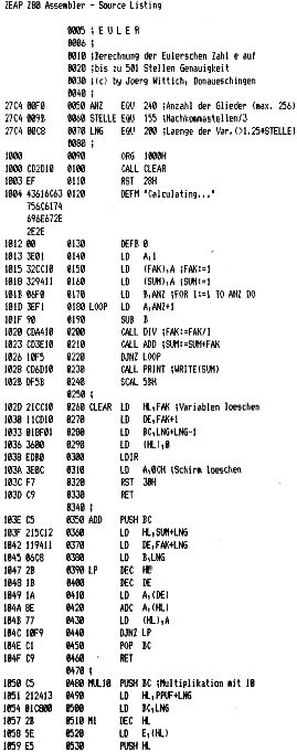 Das Programm EULER berechnet die EULERsche Zahle=2.718… auf 500 Stellen Genauigkeit. Das hat zwar fuer die meisten wohl keinen praktischen Nutzen, aber vielleicht dient es ja auch als Programmierbeispiel fuer das Rechnen mit mehr als den 6.5 Stellen im Basic.