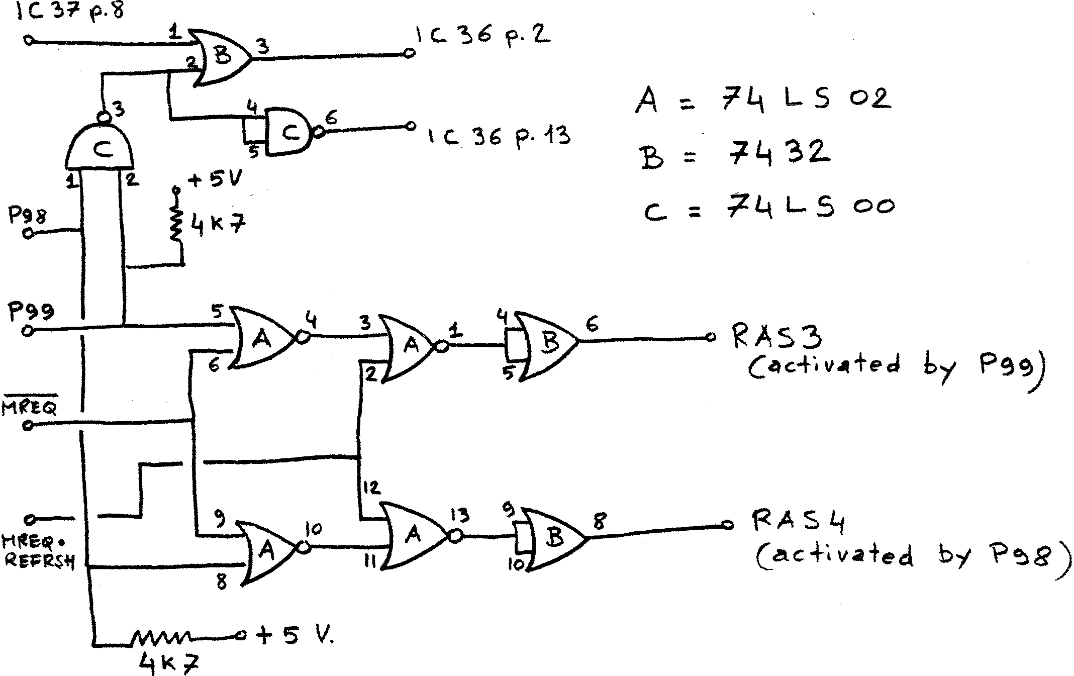 The step-by-step instructions given by Mr Fisher are still valid, you just have an additional address select pad, let’s call it P98, and an additional RAS (RAS4) which must be connected to the fourth row of 4116’s piggy-backed on top of ICs 4-11. As already stated in the aforementioned article, you must not connect pin 4 of the top 4116s in parallel with pin 4 of the ICs below. Instead all pin 4s of the fourth row of 4116s must be wired in parallel and then to RAS4.