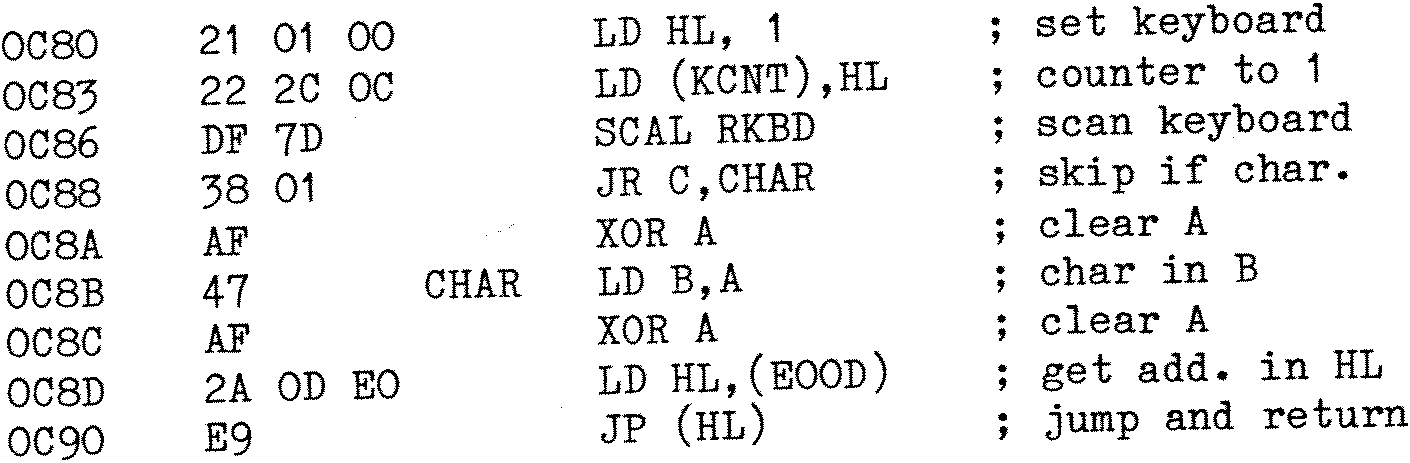 If you have the cassette version of ZEAP 2.0 on your Nascom you can add the facility of a tabulator function when you use the Auto Input Mode. It is annoying to have to hit the space bar to move the cursor to the next field every time you do not have a label to type in. When adding the function below, typing “enter” causes the assembler to figure out where on the line the cursor is and moves it to the mnemonic field if the cursor position before was in the label field or to the next line if it was in the mnemonic field. If you type a “;” the cursor moves to the comment field and “;” is typed out, except when the cursor position before was in the label field. Then “;” is typed out at the first position in the label field.