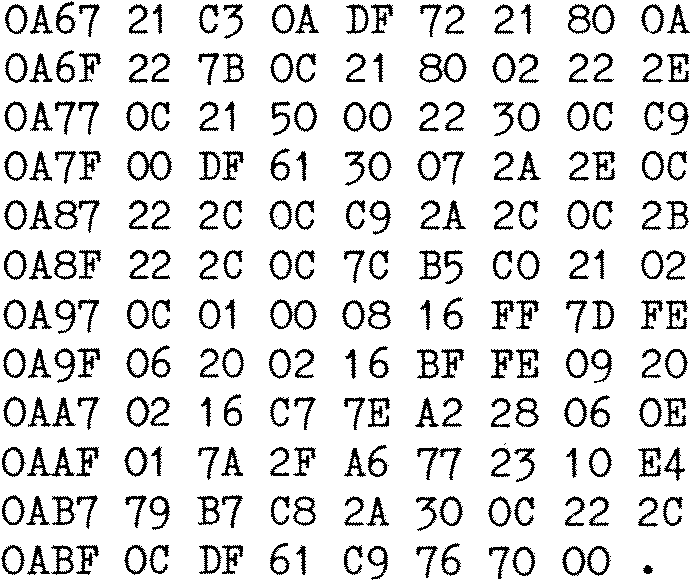 For those of you who just groaned because I’m too mean to type in the source, I’m not, it’s exactly the same as the INMC-6 (compatible) one with the addresses changed and a RET NOP replacing the original SCAL MRET. So, now the clever ones amongst you can work out how, by using the Y0 and Y1 commands, it is possible to turn the repeat on and off. You have 55 bytes to play with, that should be ample, or you could even make it execute automatically after a cold start, but note that after the workspace has been initialised.