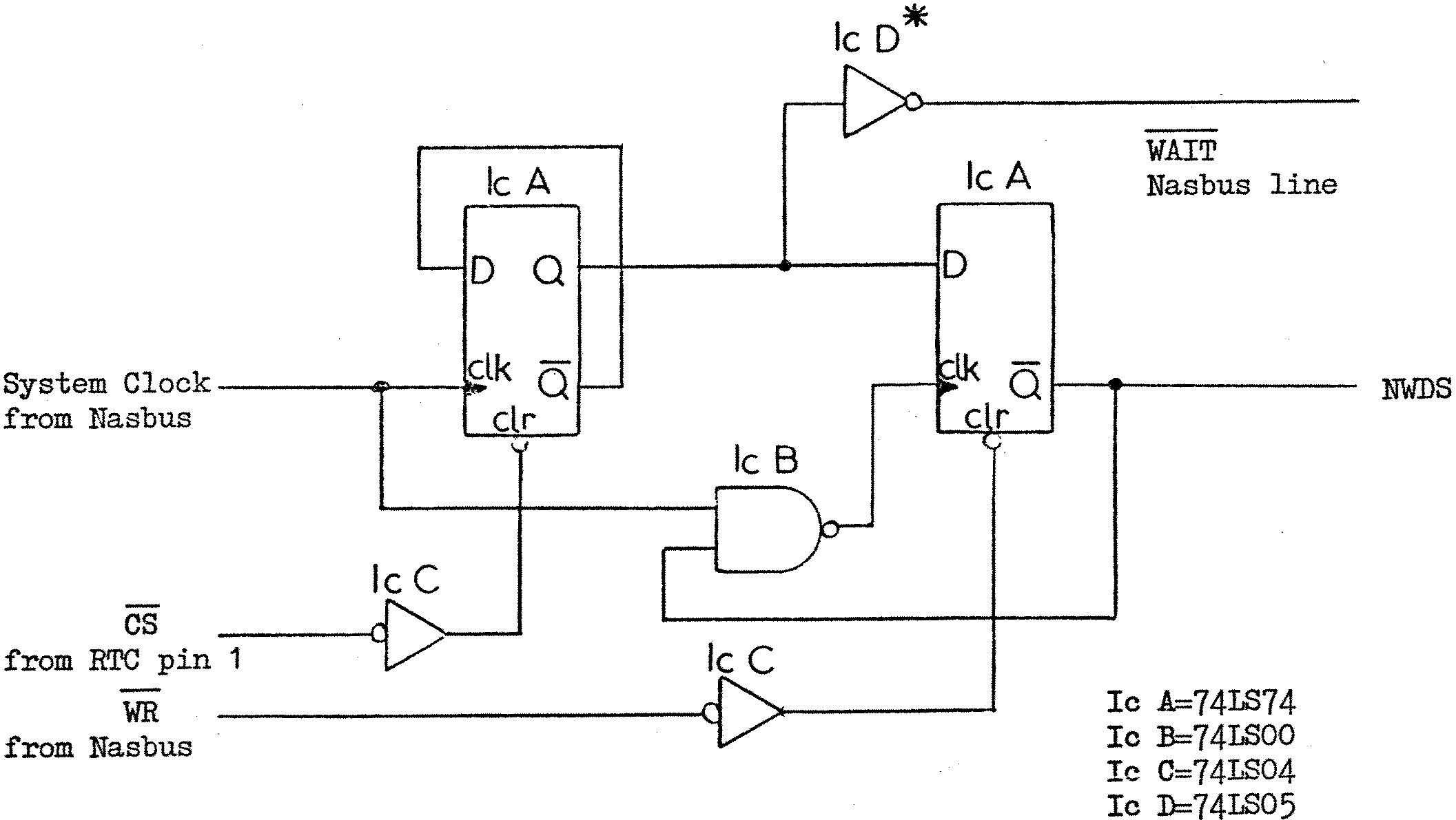 The RTC requires a delay between chip select and the write pulse (NWDS) of at least 310nS., and a write pulse width of 430nS minimum. Although Mr. Williams’ design is working at 2 MHz on a Nascom 1, it may not always because it does not provide the chip select delay. This would be worse on a Nascom 2 at 4 MHz.