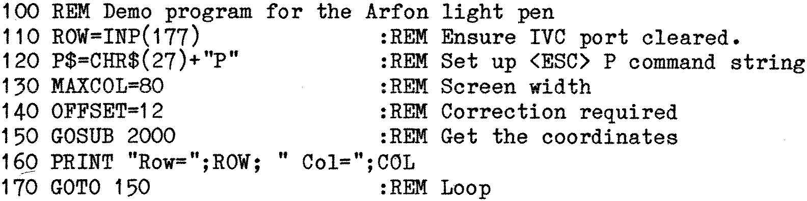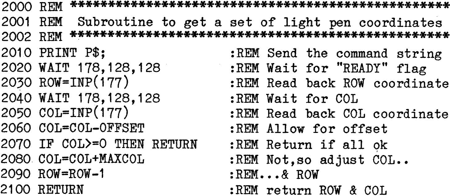 With the Gemini Multiboard system or the GM809 disk system (with CP/M 2.2) the situation is more complicated. This is because the IVC card is occasionally being interrogated by the system software to check if there is any character waiting from the keyboard. (This check occurs whether or not a keyboard is actually connected to the IVC). Because of this it may not be possible to use the method of example 1 to get the light pen coordinates, and a machine code subroutine has to be used. Such a subroutine is listed in example 2. This is slightly more long-winded than necessary, but it has been written to be position independent so that it may be copied directly, and no recoding is necessary wherever you decide to place it. This program is included in the Basic routines that follow within the DATA statements.
