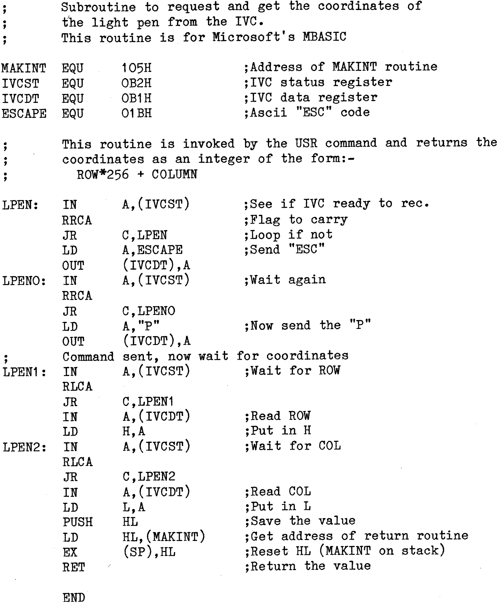 Note: In line 1020 ADDR holds the address of where the USR routine is stored. Nascom Basic/Nas-Sys users should pick an area within the workspace RAM (0C80H-0FFFH). GM809 users on a Nascom can use the workspace RAM as well, though in their case it is located at 0FC00H-0FFFFH. (NB Your CP/M system size should be 63K or less if you intend to use the workspace RAM).