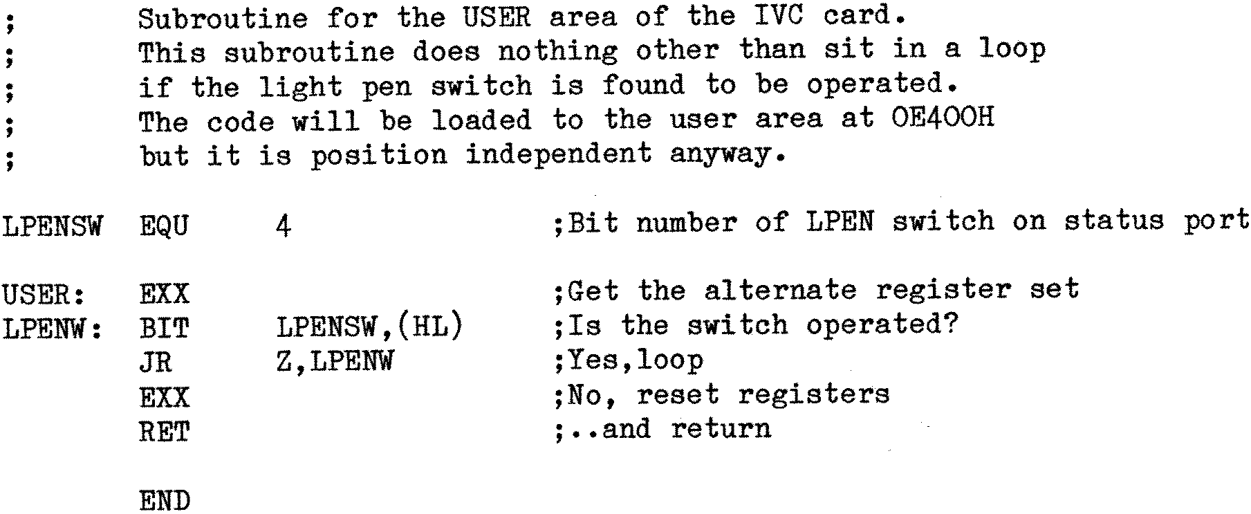 This example is in fact an extension to example 3, and uses the ESC L and ESC U commands to provide a “single shot” operation of the light pen switch. This is done by downloading a very short program to the IVC and calling it before requesting (or after reading) the light pen coordinates. What the routine does to sit in a loop until the switch on the light pen is released, and so the switch has to be released before another pair of coordinates can be read.