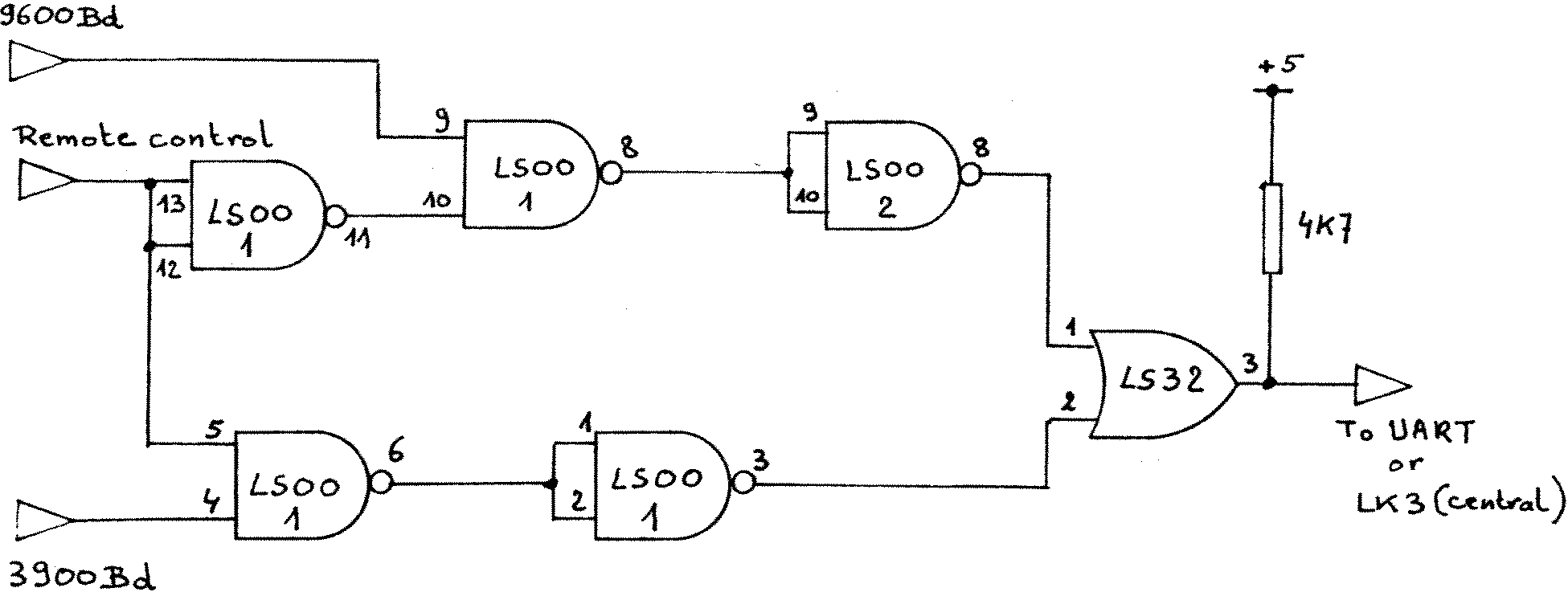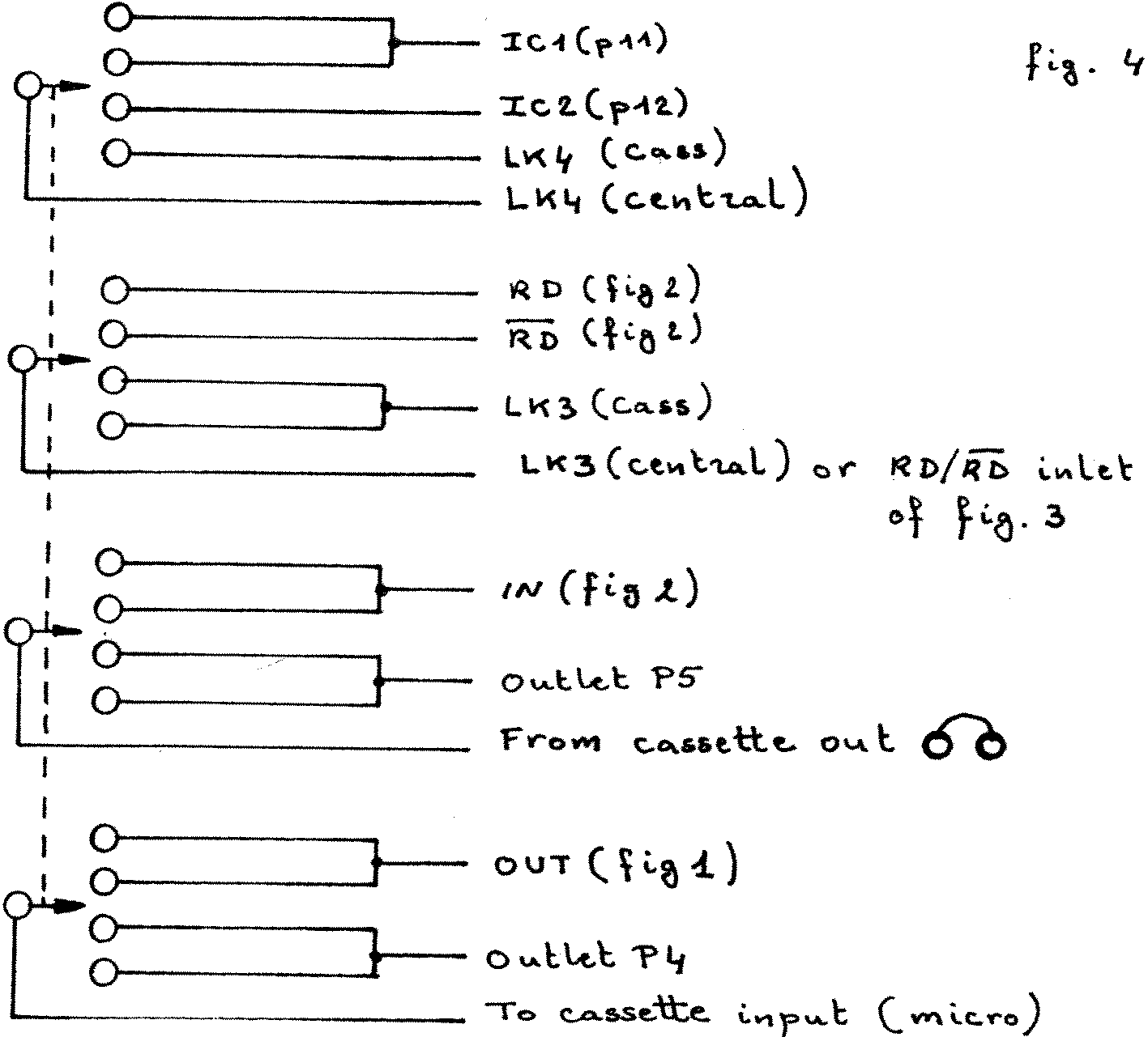 I now had to switch two different clock rates to the UART, 62.5KHz for tape and 153.6KHz for the printer, this was achieved by using the circuit in fig. 5., and remotely controlling the change over by the state of the ‘tape LED’. The control signal should be taken from pin 3 of G1 of the Computing Today tape controller, or from pin 12 of IC41 if the former is not installed. When the tape LED is active, during a Read, Write, Verify, CSAVE or CLOAD command, the clock rate is switched to 62.5KHz, at all other times it is switched to 153.6KHz.