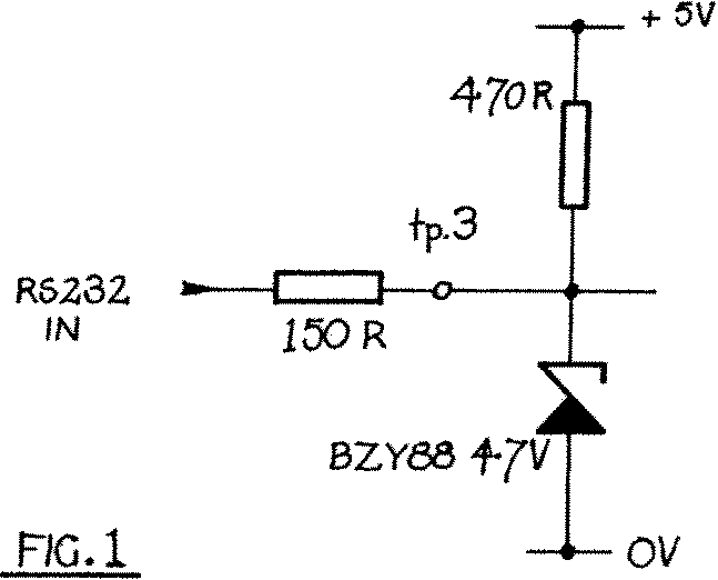 Now with some printers the DTR signal is provided at TTL levels and this may be connected directly to bit 7 of the Nascom keyboard port. More typically the DTR signal swings between +12 and −12 volts, this being the standard voltages employed by the RS232 protocol. Direct connection of this signal to a TTL input will lead to the instant death of the input latch and possibly other damage. Some method of limiting or converting the +12/−12 volt signal to an acceptable +5/0 volt swing must be used. The ideal answer is a 4.7 volt zener diode with the cathode (the end with the coloured band) connected to the input pin, and the anode connected to the 0 volt rail. As the zener is reverse biased when the +12 volt signal is applied, it will conduct and limit the incoming voltage to +4.7 volts. When a −12 volt signal is applied the diode it is forward biased and the voltage will be limited to about −0.6 volts. Entirely suitable for the TTL input. Unfortunately, the zener diode can not be connected directly across the incoming DTR line, as, if the sending device, the printer, is capable of supplying any amount of current the conduction of the diode would allow a considerable current to pass, damaging either the diode or the printer or both. A series limiting resistor of 150R provides the answer. This should be connected in series with the incoming DTR line. The complete circuit is shown below: