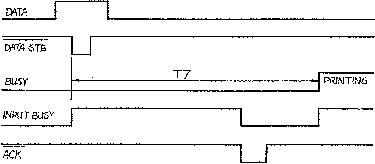 It has been noted that the printer sends an ACK signal after each character. At first sight this may appear to a good candidate for a handshake signal. However, almost all Centronics type printers can not accept data during a print and carriage return/line feed cycle, so the BUSY line becomes a better candidate as this is active during the print and CRLF cycles. The ACK signal is simply ignored, and in practice this has been no impediment.
