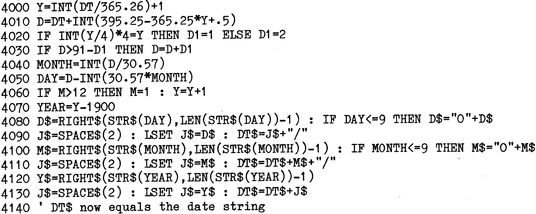 An off shoot of presenting the date is the ability to use the date in numerical sorts. The obvious method is split a date into its component parts, using the tens and units of the year, the month and the day; so that 21/09/82 would end up as 820921. This would work as each day is a unique number and days increase in ascending order. However, the number sequence is not contiguous which could cause a number of problems, not the least of which is the complicated validation to determine if a date is missing within a sequence of dates, or possibly an extra day having been entered in error. Whilst initially attractive, the method of using the date backwards has a number of disadvantages. Better then that the number sequence be contiguous. This can be achieved by starting at a base date and counting upwards. The only problem then is to decide the base date and how to cope with leap years, etc.