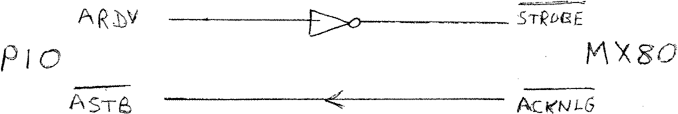 Can it be that I am the only reader of 80-bus News to realise that the PIO’s RDY and /STB lines are ideally suited to handshaking with the printer’s /STROBE and /ACKNLG lines? All that is required is the addition of an LS TTL inverter: