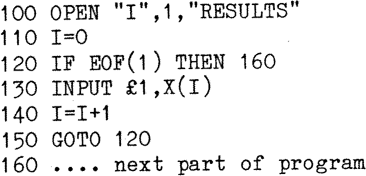 LINE INPUT may be used with disk files and has the same format as INPUT; it is used for reading in an entire file line without using quotes, commas etc. and is particularly useful if a SAVEd (ASCII) BASIC program is to be read as data by another program.