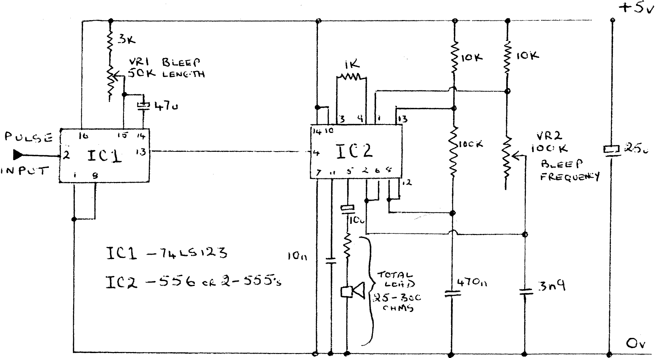 As I have not got an IVC I’m not sure what sort of signal is available to trigger the bleeper, but the circuit below is quite simple and could be easily. adapted to work from any input. The rising edge of a pulse will trigger the monostable IC1 and this will make the output go high for a period determined by the setting of VR1. Whilst the output of IC1 (and pin 4 of IC2) is high then IC2 will oscillate and produce a two tone warble from the speaker, the tone of the warble can be altered by VR2. The volume is controlled mainly by the type of speaker used. I found an old telephone insert with a DC resistance of 80 ohms which works well, but a conventional speaker can be used. I’ve got my bleeper hanging on bit 2 of Port 0 where it is activated by sending this bit high, this is simple in machine code or BASIC.