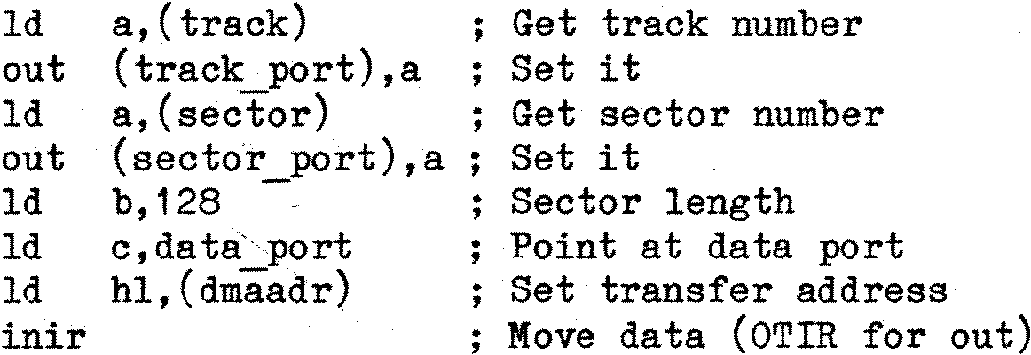 The seven-bit counter is controlled in two ways: Whenever data is written into the ‘track’ register, the counter is cleared. Whenever data is read/written to the data port the counter is incremented. Thus the memory array can be regarded as a disk of sixteen tracks, (the low four bits of the ‘track’ register), with 256 sectors per track, (eight bits of the ‘sector’ register), and with 128 bytes per sector, (the seven bits of address from the counter). So transfers to and from the RAM-DISK occur in blocks (or ‘sectors’) of 128 bytes each. A typical CP/M driver for the board would look like: