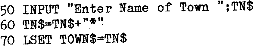 Assuming use of a 20 byte field, and that the word ‘LONDON’ is INPUT, this would store the Field TOWN$ as ‘LONDON* ‘. To extract the Town from the Disk Record, less blanks and Field terminator, the following type of routine can be used :
