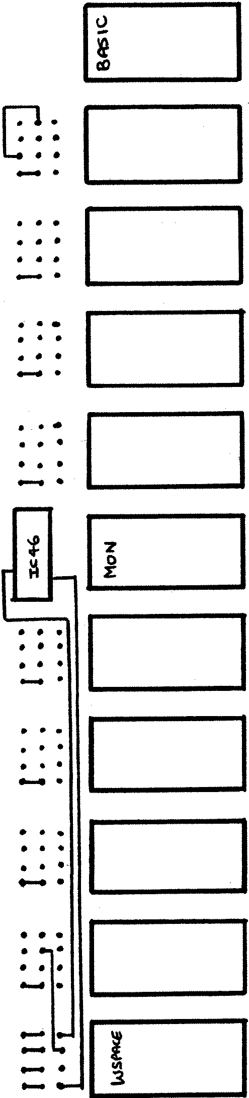 Start by removing the N2 from its card frame and placing it in front of you. Remove any EPROMs already fitted in IC sockets 35-42. Remove any associated links from LKS1. (This should just have the standard 3, 1-16 2-15 8-9). Remove all links from the strapping fields LKB1-LKB8. TEST. Put the card component side down with the EPROM sockets along the bottom. Ignoring the workspace RAM at the right hand end, wire together all pin 19s of the byte-wide sockets including the Monitor and the Basic ROM. (This connects in A10.) See Fig. TEST. Next wire together all pin 20s, this time only do the 8 empty sockets, Do not include the monitor or basic. test. Next wire together all pin 21s, once again only do the 8 empty sockets, Do not include the monitor or basic. test. Turn the card over. On the eight link blocks link pin 4 to pin 8. (Connects /CS from decoder to /CE) – see Fig. Test. Remove IC46 (LS155 decoder) from its socket and gently bend up pins 3 and 13. Solder two lengths of thin insulated wire to these pins.