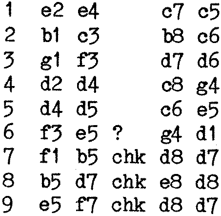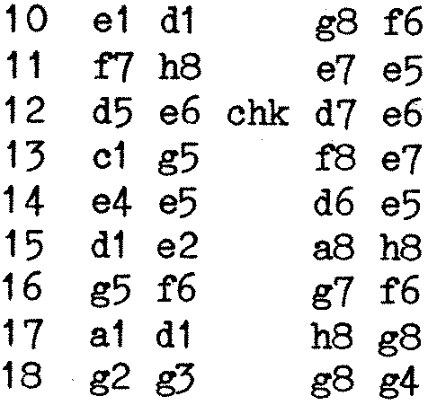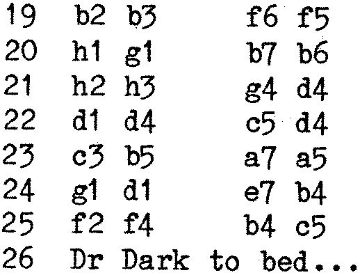 A friend of mine has been improving Sargon for some time now, and recently sent me a tape of his latest version. As it uses good old Nas-Sys in the approved manner, it works fine with MONITOR.COM, as you would expect. I beat it on level three, and decided to play it against my Spectrum, which I loaded with Quicksilva’s program “The Chess Player”. (Silly Scenario number 42, an alien android has arrived and will destroy Earth unless you can beat it at Chess! Presumably this is a sop to the space invader fans.) The resulting game was very enlightening. It was also very exhausting, as Marvin is upstairs, while the Spectrum is downstairs. This exercise factor was one reason why the game did not get finished. The main reason, however, was that the Spectrum was so dreadfully slow that in a tournament it would have run out of time. Marvin, running the improved Sargon, produced a move within two minutes, at all times. When in check, the response was much faster, under ten seconds.