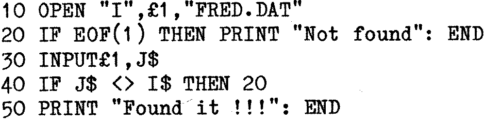 The loop is tight and it surprising just how fast this can be read. However, the time to access is directly related to the length of the file and the position of the record in the file. Of course the IF would usually be a little more complicated as it is not often looking for a complete match, more usually the compare is for the key which would be a part of J$. Despite this the process is still fast and can whip through an 8K file in a few seconds.