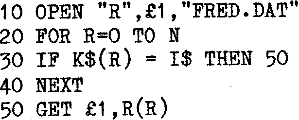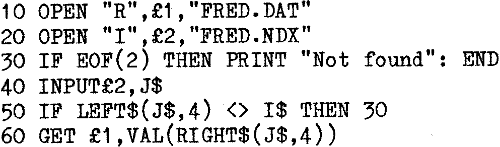 Now this would be somewhat slower, but has the advantage that any number of records (within the limits of disk size) may be accomodated. Notice that the key string is the first four bytes of J$ and the record number is held as a string in the last four bytes of J$. The major snag is updating the index.