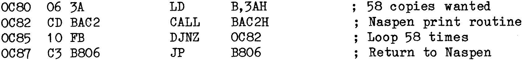 piece of relocatable code which loads the B register with the number of copies to be printed, calls the Naspen print command, and loops until the B register is zero. The code can go anywhere except the Naspen workspace. I use 0C80H.