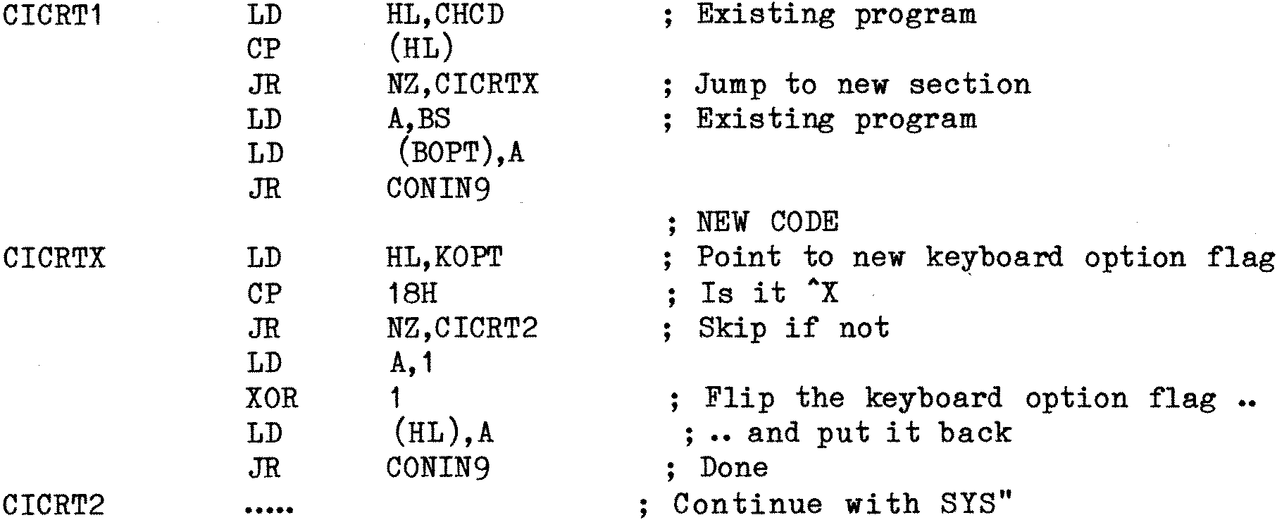 “The modification allows me to use ^X to switch between the two keyboard options. Each successive use of ^X flips between the alternative options. The control can be used inside all the CP/M packages that I possess, although there may be some exceptions to this. The listing below shows my modification to the CP/M 1.4 version of SYS.