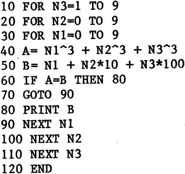To us normal Human Beings N1^3 (N1 raised to the power 3) in line 40 of the above program means N1*N1*N1. However to Nascom BASIC it means: EXP(3*LOG(N1)), where both the LOG() and the EXP() are calculated by evaluating polynomial approximations of the form: