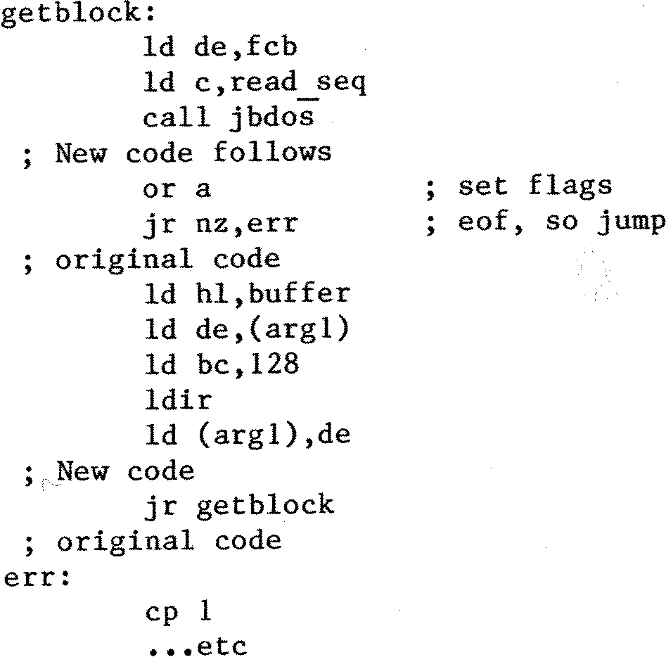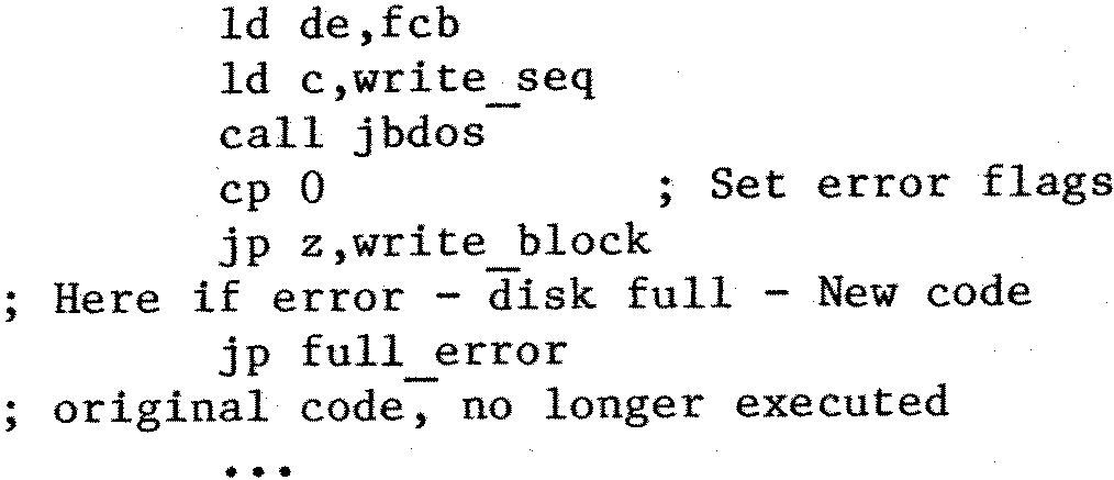 Now for the second problem: the P routine appears to “hang” when the disk is full. The patch ain’t so simple: it requires additional code on the end of Monitor.Com, and where this goes will depend on where your particular copy ends (I had tacked a printer driver onto the end of mine).