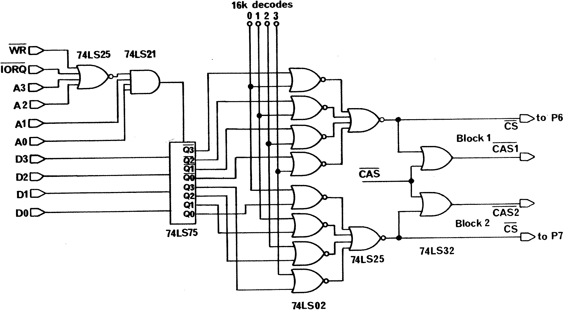 I built the additional circuitry on a 3 by 4 inch piece of Vero card which was mounted about 2 cm. above the main board; it was held at one end by wire-wrap pins which plugged into the empty EPROM sockets and was supported at the other end by two insulating pillars. These were held in place by fine insulated wire threaded through convenient holes in the boards. Connections to the various signal lines were then made by soldering to the IC socket pins on the underside of the main board. This made a reasonably neat arrangement of what is essentially a bodge job.