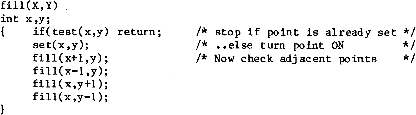 This routine will do the job. The drawbacks of it as it stands are various. If it fills an empty 256 x 256 screen in the worst possible order the routine FILL will call itself 65,535 times, requiring a stack depth of about 128k together with another 256k required for the new values of X and Y that are generated on each CALL to FILL. The problem can be eased by making FILL fill in a line at a time instead of a point, but it still requires a fair amount of memory.