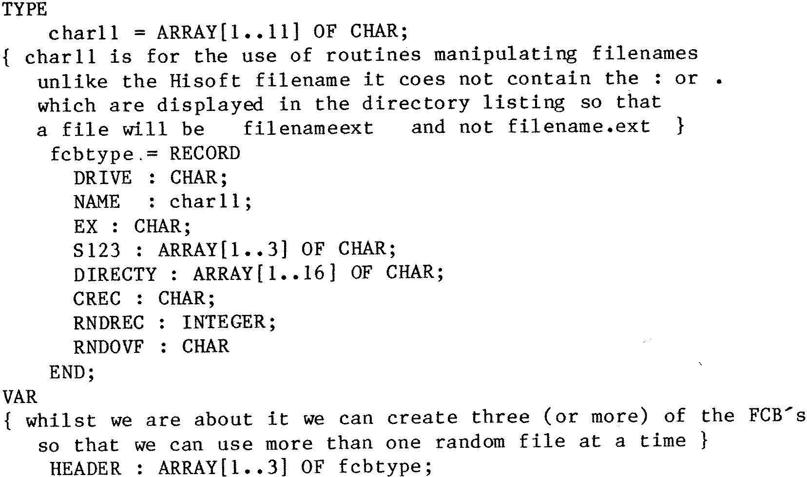 Following on from the random musings of Dr. Dark in the issue of July-August 1984, I am writing to tell of some procedures developed for just this need. The CP/M manual describes a file control block (FCB) which is used for random access, but this is not allowed for in the standard Hisoft Pascal file handler – the Pascal one is three bytes too short. So we want a definition of a FCB which can be used for random access, like this –