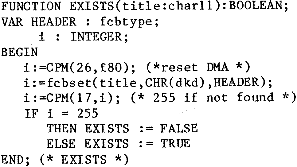 Having defined our FCB, there are a number of routines given in the CP/M manual which are of use apart from the obvious read random and write random. What of a function EXISTS which checks the existence of a file and returns a boolean value TRUE or FALSE ? Here it is –