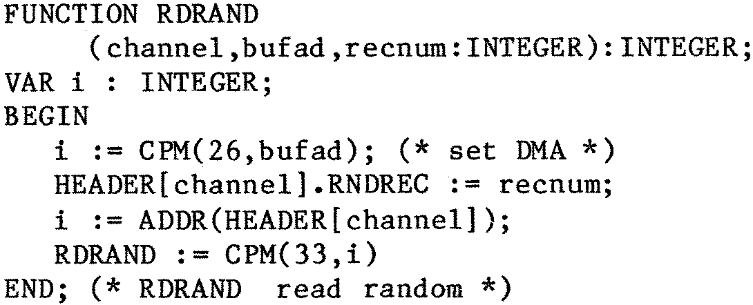 Call the function with the channel number, the ADDRess of the buffer area to be used and the number of the record. The numbers are both integers as you see so this limits you to records in the range of 0 to 32767. As the max number of a record in a CP/M file is 65535 (ie 8 Megabytes) I leave it as an exercise to any user to work out a way of getting the top half of such a large file (or for a small fee..?). Since I have mentioned fees, for a small fee I might supply all these routines (and the ones which are not given here) on a disk, but this letter should have given enough ideas to get anyone going in the fascinating jungle of random-access files.