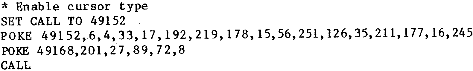 All that apart, I use dBASE with the reply prompts highlighted, that is, in inverse video, and I like to see a flashing cursor under these circumstances anyway. Further, the prompt is usually on the eighth line which looks untidy as it overlays the underhangs on characters like lower case g, j, y, etc. So I like to see a flashing cursor on the 9th line when using dBASE. How can this be achieved?