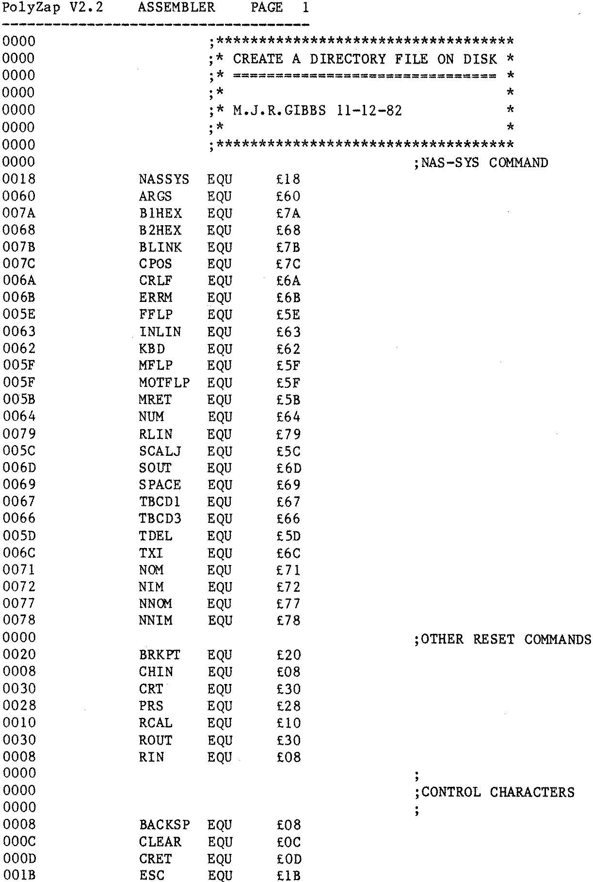 This program is split into two portions. Firstly there is a machine code program that gathers up the data and secondly a BASIC program that processes the output and sorts the data into order. The machine code section is loaded into RAM at £1000 and executed at £1000, the user is asked to load the disk into drive 0 and press enter, this reads into RAM the directory and is a very quick operation. When all the directorys of the disks have been read in then the user presses the ‘ESC’ key, you are asked to insert into drive 0 the disk which will contain the completed directory file. This will be the disk containing the BASIC program. The BASIC program should then be run, it reads the file generated by the machine code programme, prints it out, sorts it into alphabetical order and prints it out again. After this it prints out the disk summary. The BASIC program is able to remove certain files name from the listings, for example all disks have the file ‘Exec’ so there is no need to list it out. The user can change or add to lines 1260 – 1480 which is where all the unwanted file names are removed. The file produced by the machine code program can be viewed using the Polydos LIST option or changed using the EDIT facility (be careful as this may well stop the BASIC program operating correctly).