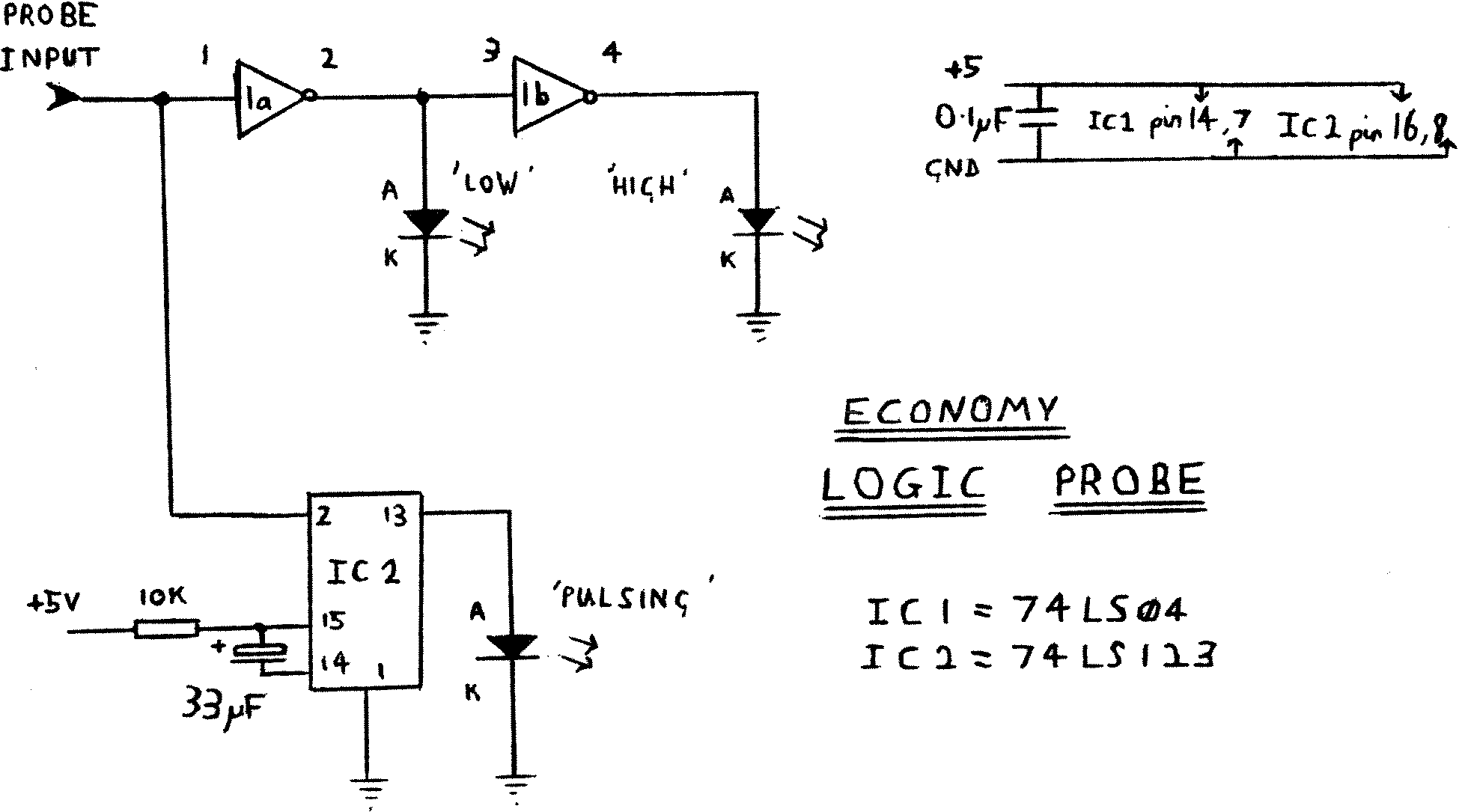 Recently, while debugging a new board for my beloved Nascom 2, I needed to test the outputs of some chips in a manner that really required a logic probe. As the cheapest probe I could find was a £12 kit in an old Technomatic catalogue, and there was no way I would spend that kind of money if I could help it, I set about designing my own.