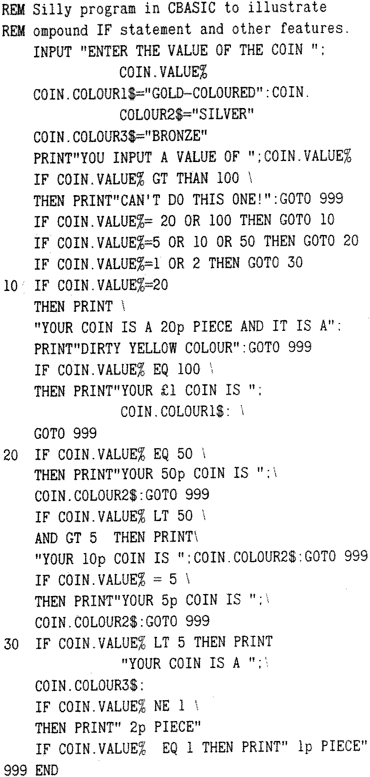 in addition to the normal IF … THEN … <ELSE> statement, CBASIC has an amazing feature called the Compound IF statement where many comparisons can be made. A program which illustrates this and the use of other CBASIC features may help explain this very useful facility: