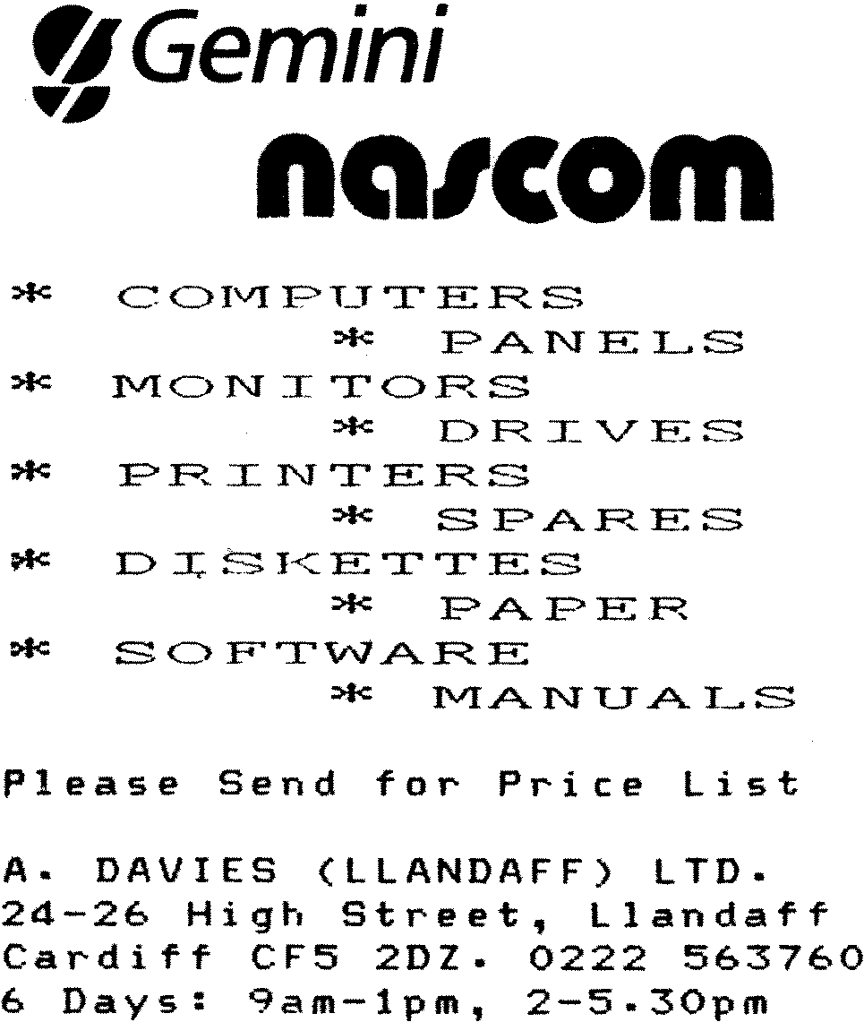 CBASIC is not really designed for the inefficient, impulsive or non-structured programmer, but it has some excellent features which render it very useful for commercial or scientific applications. Until Microsoft dropped their absurd royalty claims on published programs written in compiled MBASIC a couple of years ago, it was the preferred BASIC language used in commercial software and the CP/M User Group library. Benchmark tests show that it is somewhat slower in single precision arithmetic than compiled MBASIC (but it works to nearly double the level of precision). It appears to be more accurate in handling numbers with several significant figures, but I have not tested this exhaustively yet; a future article on benchmarks will deal with this aspect and will include comparisons of both BASICs and some other languages (including P*SC*L and F*RTR*N) on 80-BUS machines. Although it is not available from Gemini, several software houses will supply it at round about £120 — about half the price of the MBASIC interpreter. DRI’s CB-80 which has a true compiler currently costs about £400.