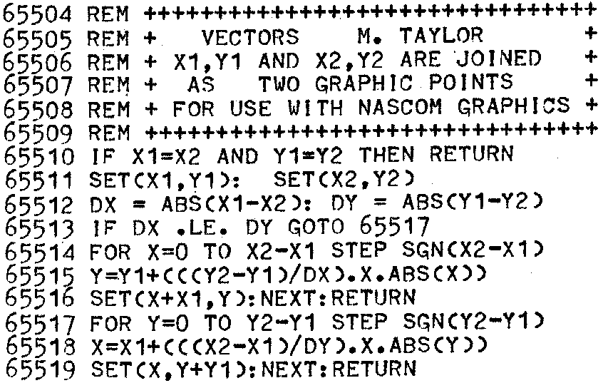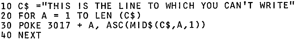 1. The Nascom suggestion for writing to line 16 is to first write on line 15 and then transfer this to line 16. This does work but gives the appearance that the program has gone wrong – and we all know our programs never do that! The following routine writes a string C$ directly to the top line:–