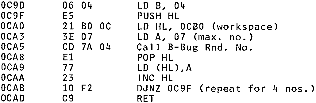 I’m sure a lot of you and other Nascom owners have tried the Mastermind game by D. Ritchie, which you have featured in the mag. This is one of the best games around, the Nascom usually beats me, but the only let down in the program is the poor random number selection for the ‘computers guess’, which after a few goes in predictable, 0123, 5567, 3455, typical of its guess’s. I feel this is due to the simple use of ‘ED 5F’, location 0C9F. I have worked out a simple random number generator which works a lot better, using the rnd. no. generator of ‘B-Bug’. (What’s B-Bug ? –Ed.)