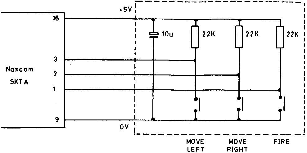 In principle, the ideas given above can be adapted to suit many games. The unit makes Space Invasion much easier to play and saves wear and tear on the keyboard when hitting the keys in the excitment of the game.