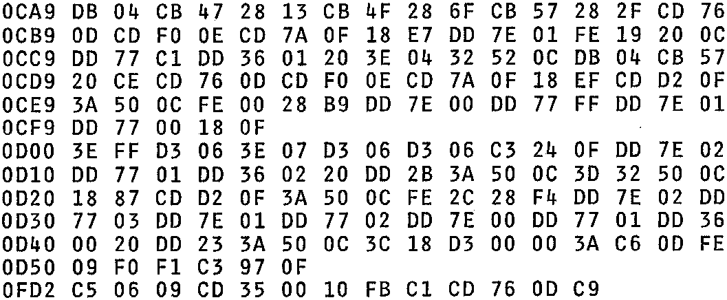 The program to drive the game replaces the code using the keyboard exactly, apart from the delay routine which follows the end of the original coding.