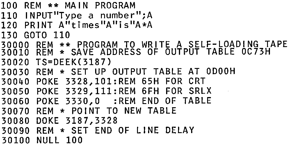 It is necessary to insert delays between these commands to allow time for them to be processed when they are fed back in. The NULL command should be used for this. It is easiest to put all this into a little program at the end of the main Basic program, and run this when you want to create a self loading tape.