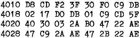 By the way, to digress (so soon already), object listings are the name given to those columns of HEX digits which appear when you use the Tab command on the Nascom. I don’t know why it’s called ‘object’, it doesn’t seem important to know, and I’ve never exposed my ignorance (till now) by asking anyone. The term ‘object listing’ refers to the machine code instructions (in this instance displayed in HEX) tabulated in some form that the programmer can read (it may also refer to a form that the computer can read). Essentially, it is the machine code instructions to the compute. It’s not confined to the Nascom form of display where each line starts with an address, followed by eight bytes displayed as two HEX digits each. For that matter, given that one byte (eight binary bits) only needs two Hex digits to express it, the space between each consecutive byte is not really required. Likewise, provided we know where the start address is, the address given at the start of each line can also be deleted. The result could be something like this: