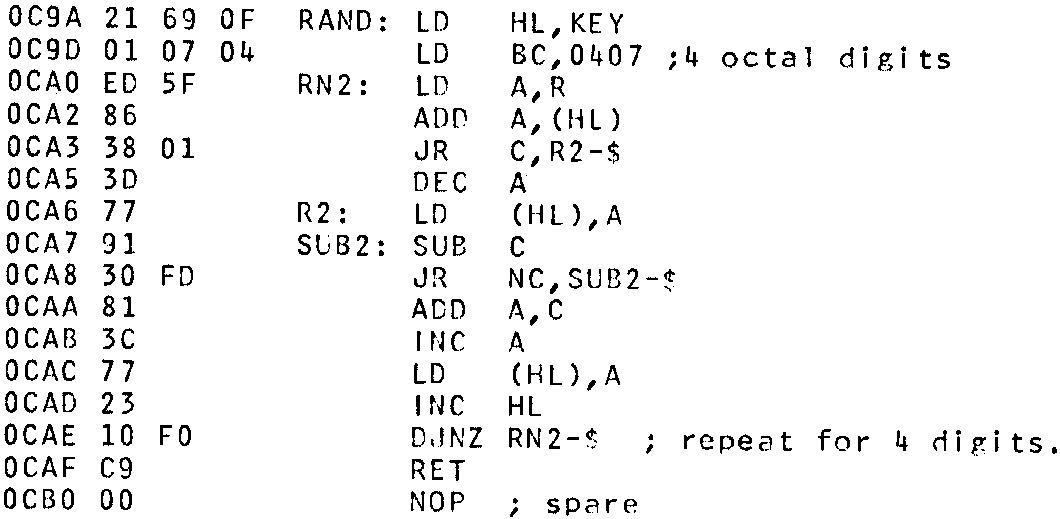 Thanks to G. Benson for the suggested mods to my mastermind Program in INMC80 1. The program was written before B-BUG was avalible, and the random number routine I used was rather poor, but was the best I had at the time. For those without B-BUG here’s a modified version of its random number routine, which fits in place of the old RAND routine in Mastermind: