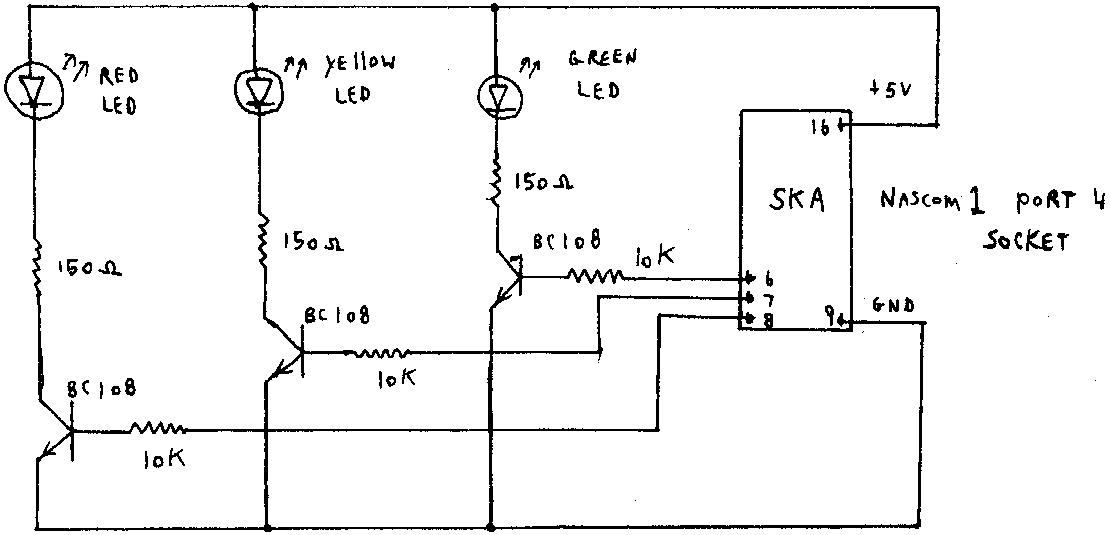 Here is a simple hardware software combination suitable for an LED traffic lights display, as requested in INMC80 1 by P. Nurse. First the hardware, three transistors driving LEDs from the PIO socket SKA, on bits 5 to 7 of port 4: