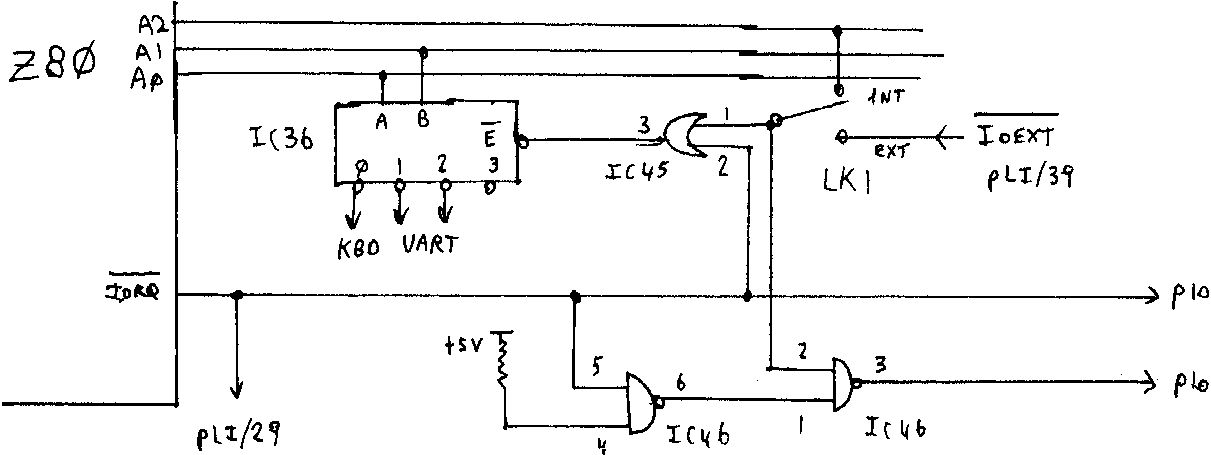 As can be seen on internal port decoding, if A2 is lo then the keyboard and UART ports are selected while A2 hi selects the PIO. Unfortunatly on external IO decoding IOEXT has the same effect as A2 had, so that there is no way of turning off the Nascom 1 ports. Fortunatly the circuit can be corrected with the existing gates, to the following: