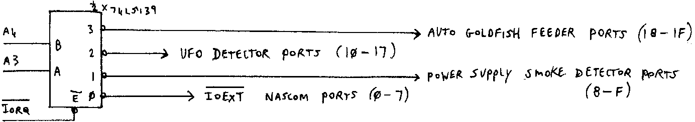 To make this modification disconect pin 2 of IC45 and pin 5 of IC46 by cutting the tracks on the component side, then join these two points together and to the IOEXT line at LK1, on the solder side. You can then build your IO board with the following decoding: