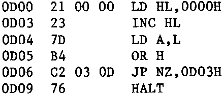 | 1000 0D03 0100 0001 1000 0000 | As there was no zero, the jump was affected and PC now points to INC HL again |