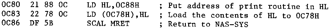 There is a snag in this, in having returned to WNAS-SYS, the UOUT reflection gets changed, so before returning to NASPEN, 0C80 has to executed again. So you have to type in E0C80 followed by EB806 (N.B. B806, NASPEN warm start). If you typed EB800, NASPEN would change the byte at 101E back to 6E, and the whole process would have to be repeated.